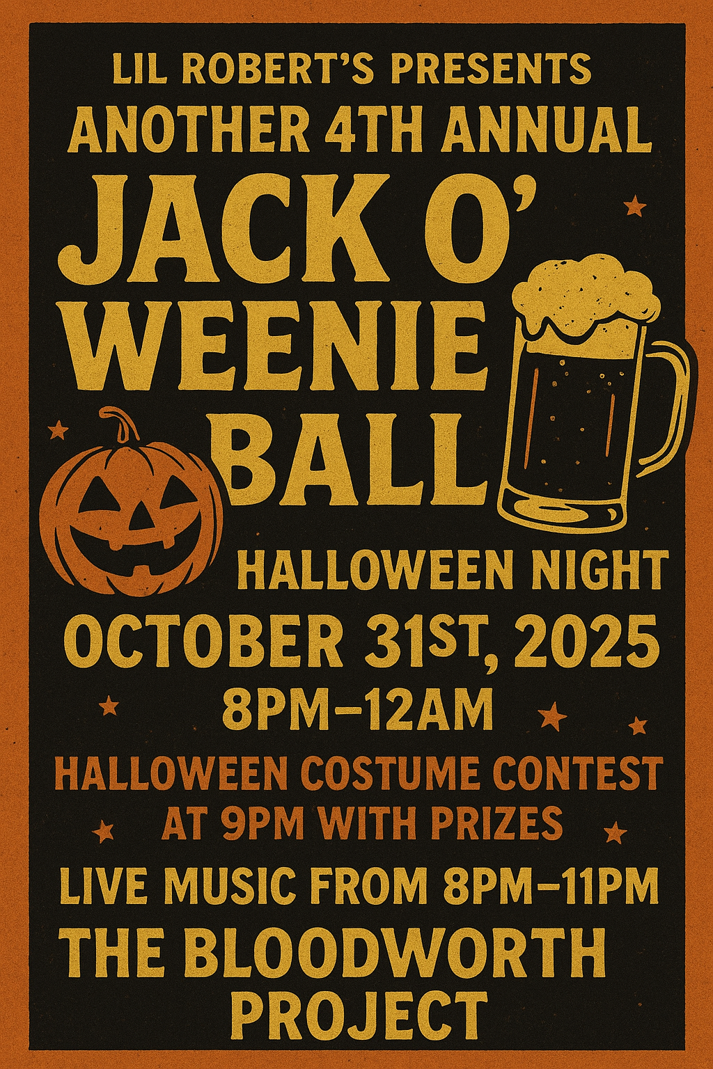 Another 4th Annual Jack O Weenie Ball is upon us again. Friday October 31st, Halloween night. Come out in your best costume for our costume contest at 9pm. Live music from The Bloodworth Project.